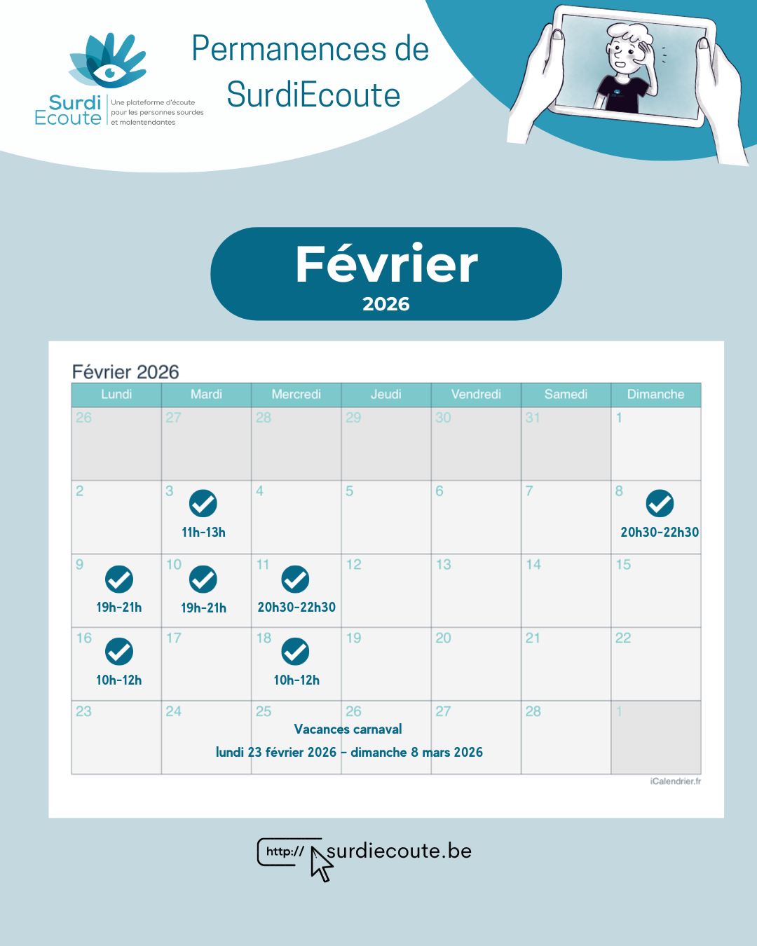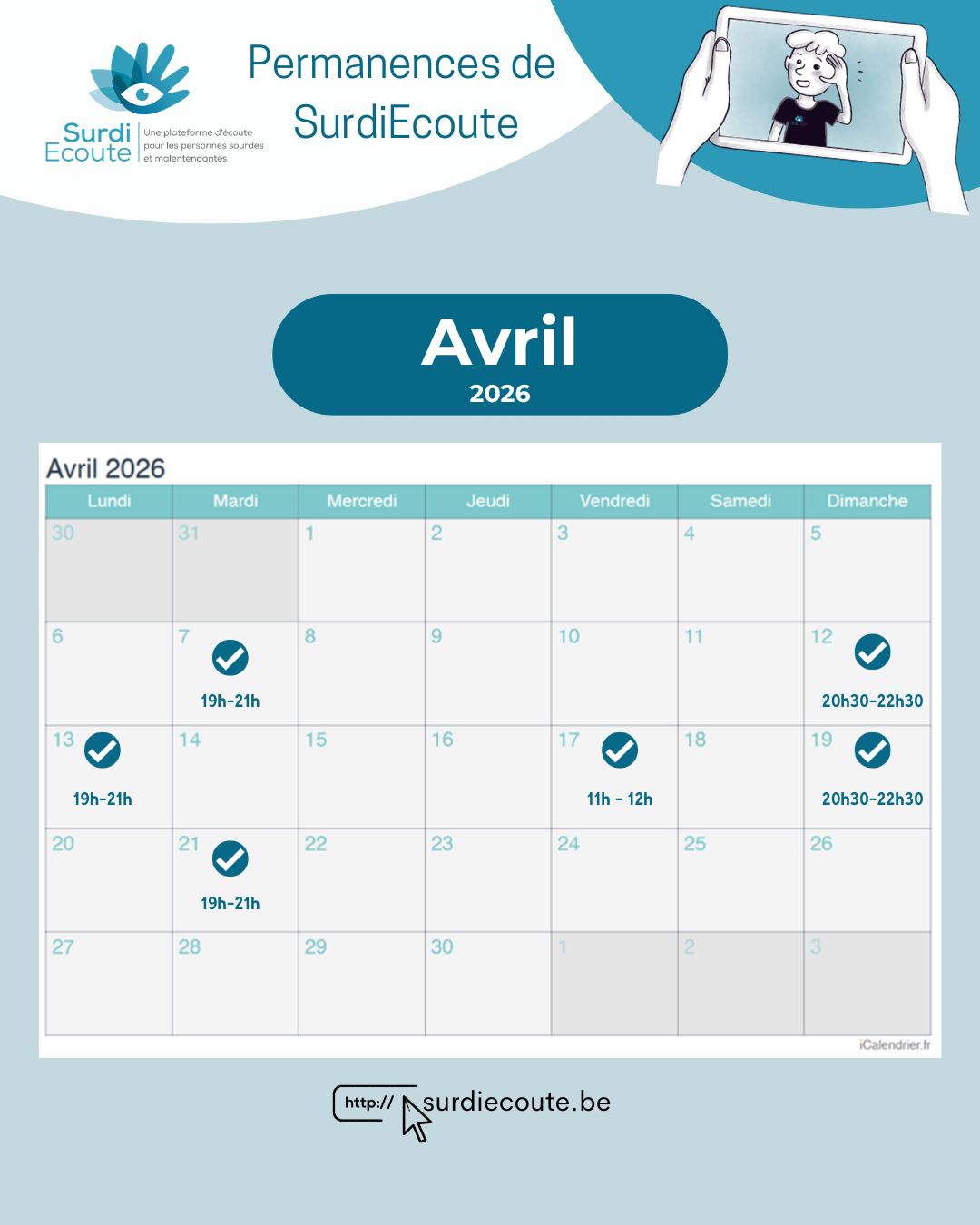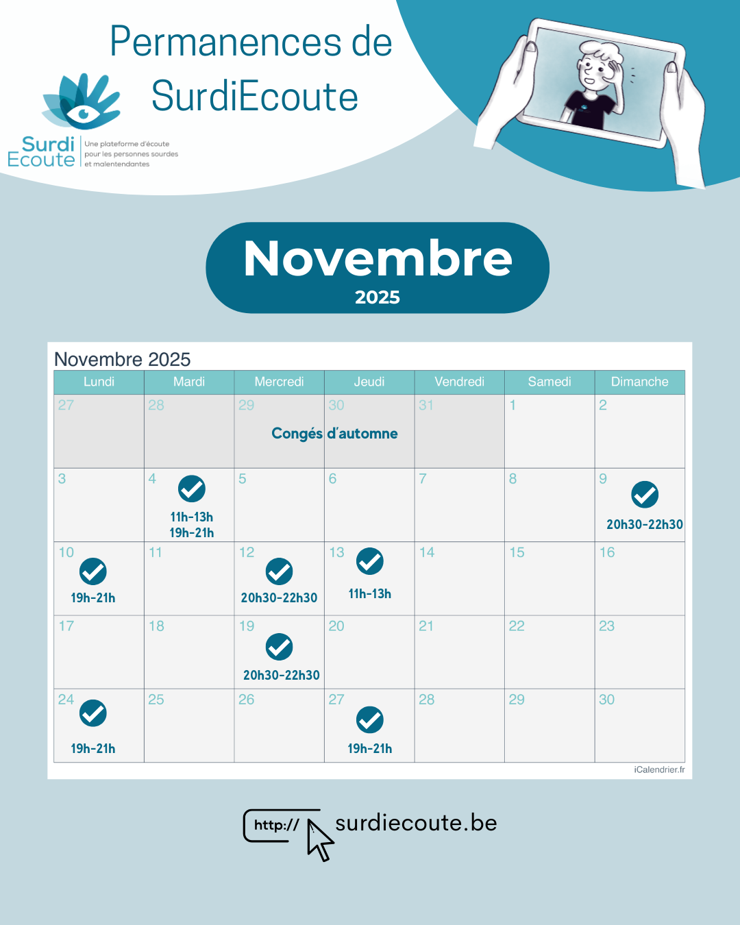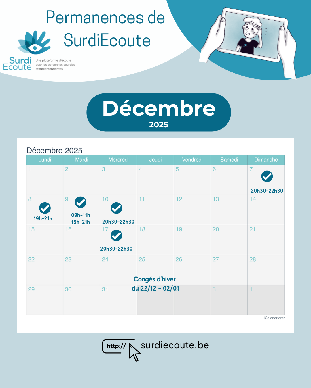 Existant depuis 2020, SurdiEcoute est devenue ASBL (une association sans but lucratif) depuis août 2023. Son objectif est le bien-être du public sourd/malentendant. L’ASBL propose un espace d’écoute à distance en LSFB (Langue de signes de Belgique Francophone) en visio et par écrit (par tchat) pour toute personne sourde et malentendante. Nous souhaitons donner l’occasion aux personnes sourdes de pouvoir s’exprimer et d’être écoutées dans un cadre bienveillant.