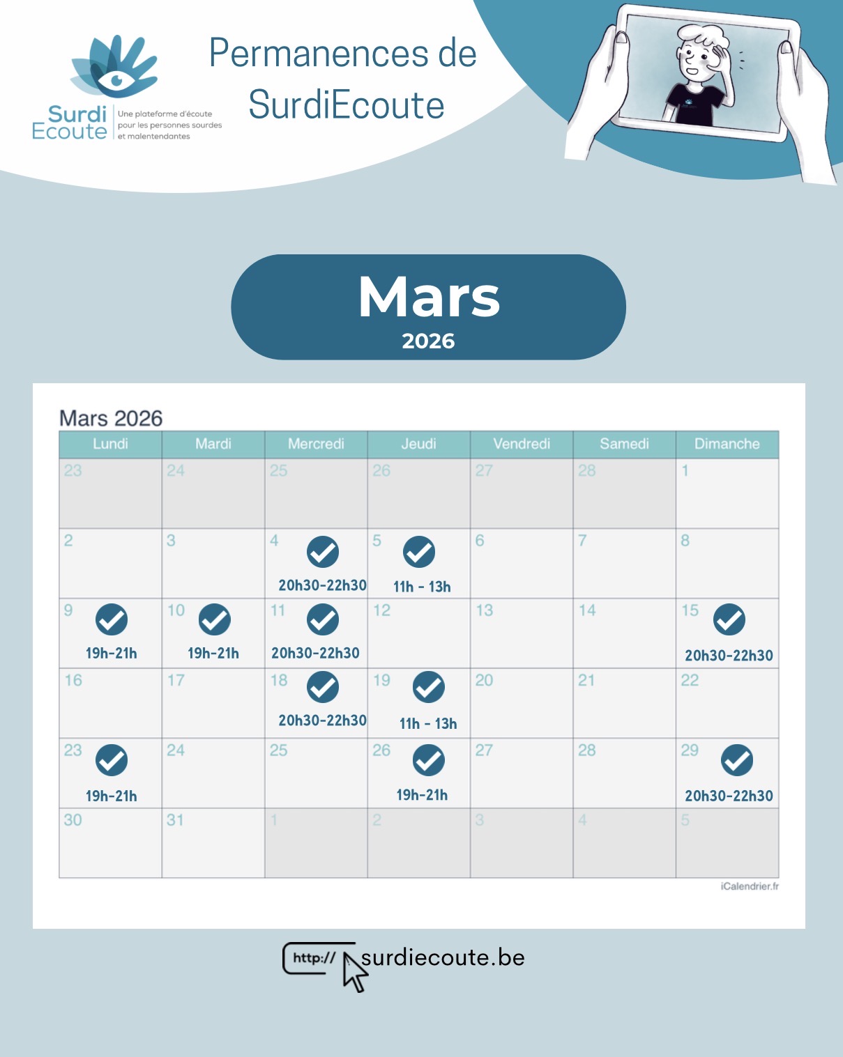 Existant depuis 2020, SurdiEcoute est devenue ASBL (une association sans but lucratif) depuis août 2023. Son objectif est le bien-être du public sourd/malentendant. L’ASBL propose un espace d’écoute à distance en LSFB (Langue de signes de Belgique Francophone) en visio et par écrit (par tchat) pour toute personne sourde et malentendante. Nous souhaitons donner l’occasion aux personnes sourdes de pouvoir s’exprimer et d’être écoutées dans un cadre bienveillant.